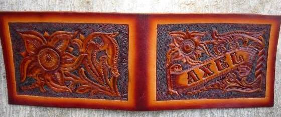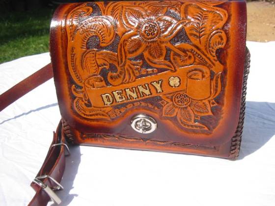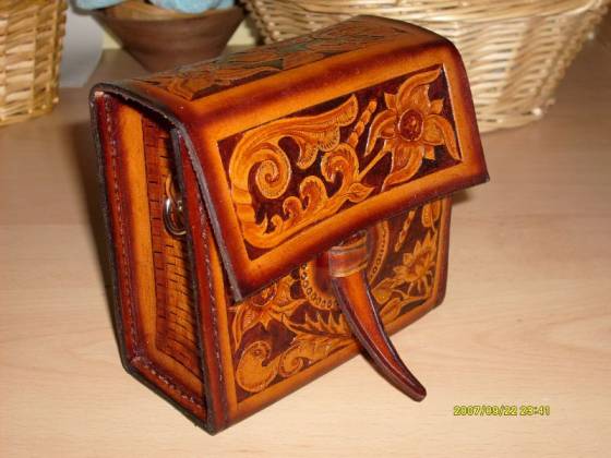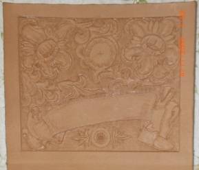 Ich nutze für die Ränder und einem Teil der Flora eine Airbrushpistole mit Lederfarbe (Chocolate). Damit lassen sich die Übergänge sehr fließend gestalten und es wird nicht zu dunkel. Man kann ruhig mehrmals über eine Stelle spühen ohne dass es fleckig wird. Der Hintergrund wird mit einem Pinsel ausgemalt. Anschließend kommt zum Abschluß "Leather Sheen" Leatherfinish drauf und fertig.