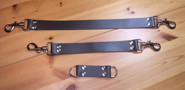 Ich habe mal aus einem Lederriemen, ein paar Doppelhohlnieten und Schnappkarabinern eine Verbindungsleine für Hand-und Fußfesseln gebastelt.