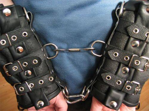 Zwar sind das nicht meine ersten Fesseln, aber zumindest die ersten mit soo einer dicken Polsterung und ca. 20cm breit! Weich gepolsterte Haengefesseln ohne durchgehende Nieten (kein Hautkontakt mit Nietennickel) und reichlich mit D-Ringen versehen. Die Breite wirkt sich uebrigens sehr ernuechternd auf Befreiungsversuche aus ;-)), da man auf dem Ruecken durch die Karabiner nicht genuegend die Haende gegeneinander verdrehen kann, um die Schnallen zu oeffnen..hihi.. oje, das tut mir aber schade...