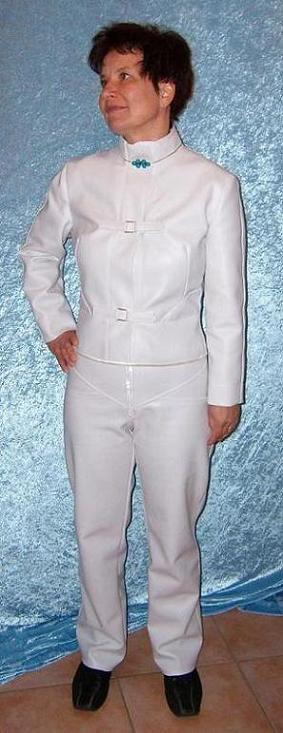 Hier mal ein Lederanzug in weißem Kunstleder, mit Weste zum Schnüren ( nicht abgebildet ).Mehr auf www.studio-ms.net.