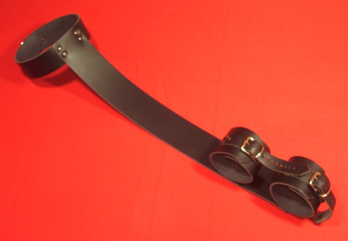 Diese Rückenfesseln bestehen eigentlich aus einem Halsband und zwei Handmanschetten an denen man anstelle der D-Ringe einen langen Lederriemen befestigt der als Bindeglied zwischen dem Halsband und den Handmanschetten dient.