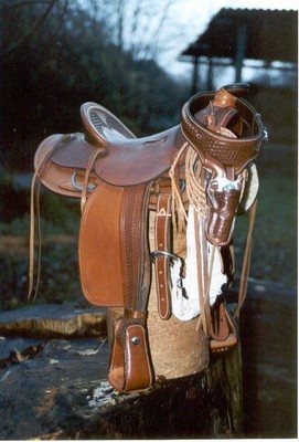 hier will ich mal eines meiner Spielereien zum Besten geben. Es handelt sich um einen Miniatur-Westernsattel im Maßstab 1:2. Ich habe den Sattel genau wie einen großen aufgebaut. Der Sattel hat einen Holzbaum, der mit Rohhaut überzogen ist. Die Skirts sind mit echtem Fell unterlegt.