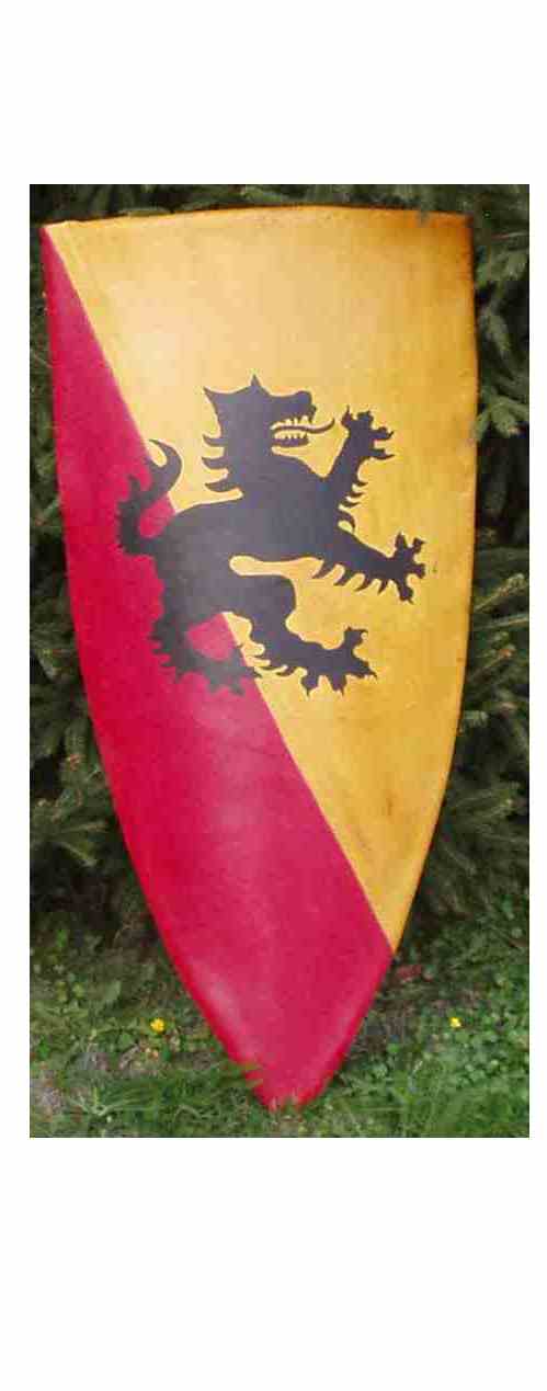 hier ein von mir gebauter schaukampftauglicher Schild. Der Schild ist mit Leder bezogen. Das Wappen ist mit Lederfarbe (Sortiment: Lederhaus, dort Lederfarbe)