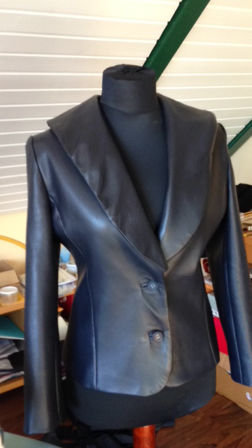 Hier seht ihr eine Lederjacke mit abnehmbaren Kragen, geschneidert von einer Lederhaus-Kundin aus unserem marinefarbenen Lammnappa Padua.